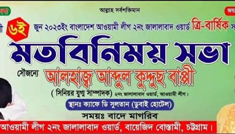 আগামী ০৬ইং জুন ২০২৩ইং তারিখে বাংলাদেশ আওয়ামীলীগ ২নং জালালাবাদ ওয়ার্ড ত্রি- বার্ষিক সম্মেলন উপলক্ষে ক্যাফে ডি- সুলতানে আলহাজ্ব আব্দুল কুদ্দুস বাপ্পির সহযোগিতায় মতবিনিময় সভা অনুষ্ঠিত হয়। সভায় প্রধান অথিতিথি হিসাব উপস্থিত ছিলেন বাংলাদেশ আওয়ামীলীগের উপ-কমিটির কৃষি বিষয়ক সম্পাদক মোস্তাফিজুর রহমান লিটন, অনুষ্ঠানে সভাপতিত্ব করেন জালালাবাদ ওয়ার্ড আওয়ামীলীগের ভারপ্রাপ্ত সভাপতি লোকমান হাকিম কুতবী, উপস্থাপনা করেন ‘গ’ ইউনিট আওয়ামীলীগের সাধারণ সম্পাদক আতিাউর রহমান টিটু, আরো উপস্থিত ছিলেন, বায়েজিদ থানা আওয়ামীলীগ নেতা আব্বাস, ওয়ার্ড আওয়ামীলীগের সহ-সভাপাত শাহজাদা আব্দুল মালেক, ও হারুন ফোরম্যান, ওয়ার্ড আওয়ামীলীগের সাংগঠনিক সম্পাদক নাজিম উদ্দিন, ‘গ’ ইউনিট কার্যকারী সদস্য মাহাবুবুল আলম রিপন, তৌহিদ আহমেদ