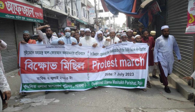 সুইডেনে কোরআন পোড়ানোর প্রতিবাদে পাবনায় ওলামা মাশায়েখ পরিষদের উদ্যোগে বিক্ষোভ মিছিল