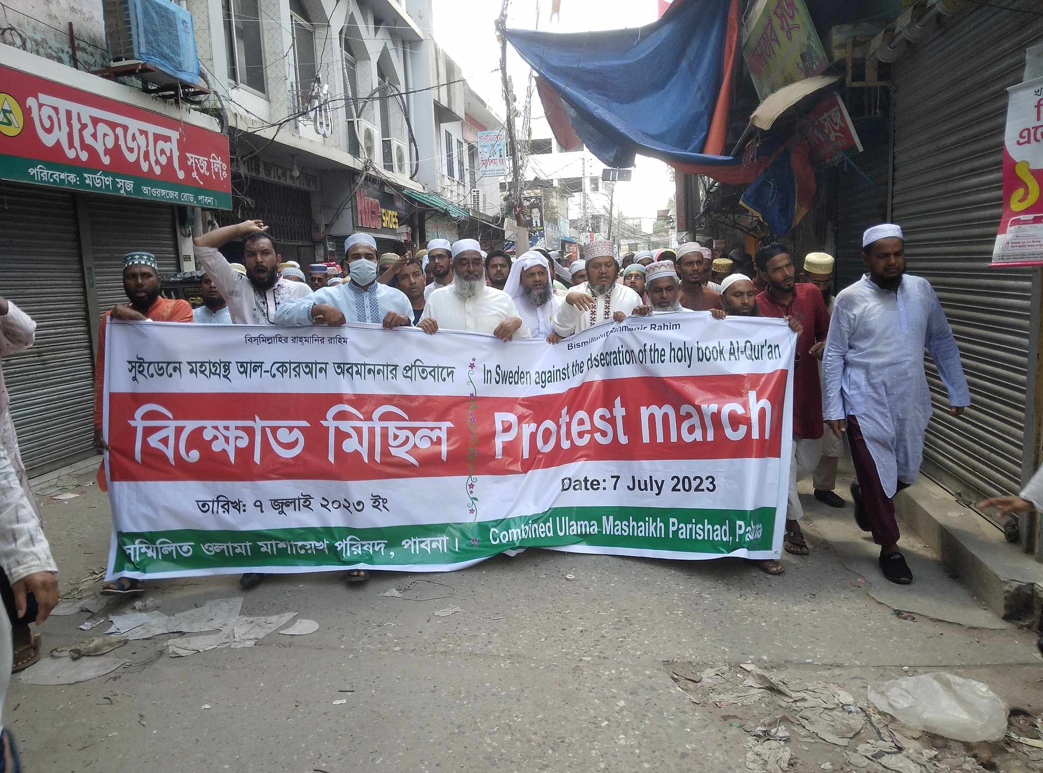 সুইডেনে মুসলমানদের মহান পবিত্র ধর্মগ্ৰন্থ আল কোরআন পোড়ানোর প্রতিবাদে পাবনা জেলার সম্মিলিত ওলামা মাশায়েখ পরিষদের উদ্যোগে বিক্ষোভ মিছিল অনুষ্ঠিত হয়। মিছিলটিতে ওলামা মাশায়েখ পরিষদের হাজারো নেতা কর্মী উপস্থিত ছিলেন। চাপাবিবি জামে মসজিদে পবিত্র জুমার